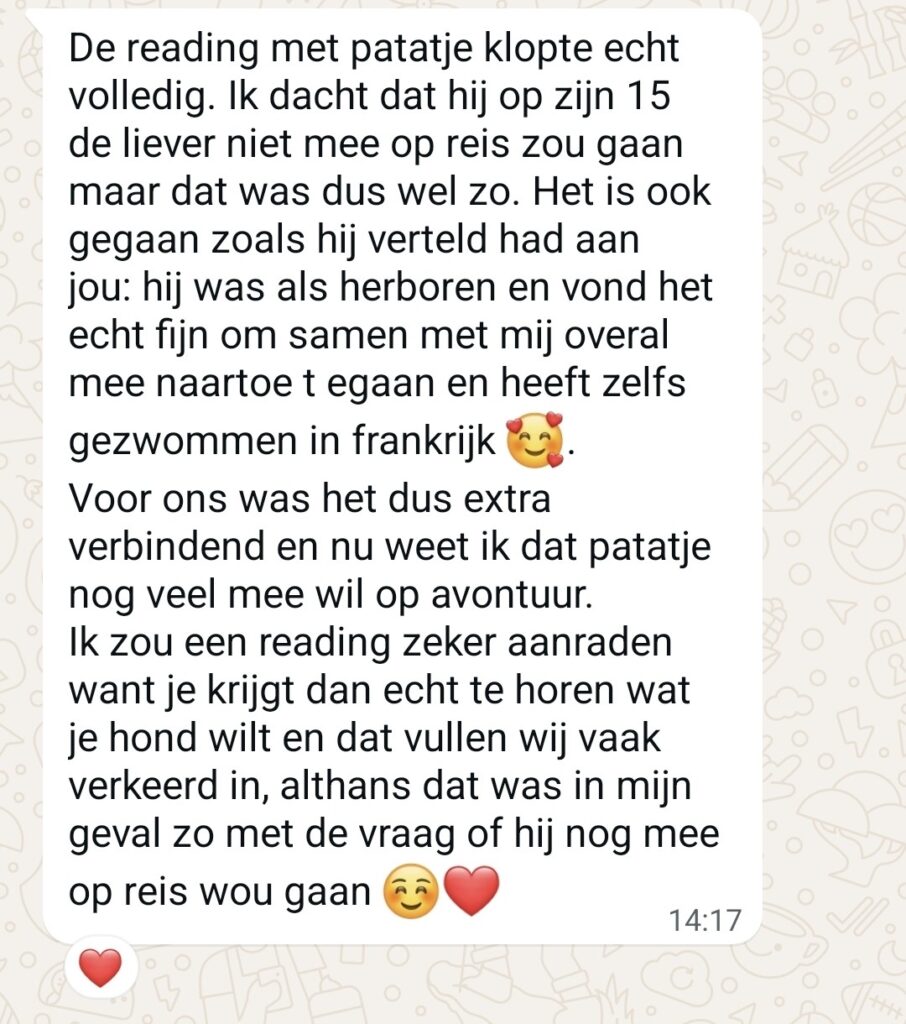 Een reading geeft niet alleen antwoorden, maar ook een nieuw perspectief. Het kan voelen als een frisse start: ruimte om anders naar je dier én jezelf te kijken, waardoor jullie relatie verdiept en er meer harmonie ontstaat. Dankzij intuïtieve communicatie met dieren ontdek je wat jouw dier je wil vertellen, en hoe jullie samen verder kunnen groeien.”